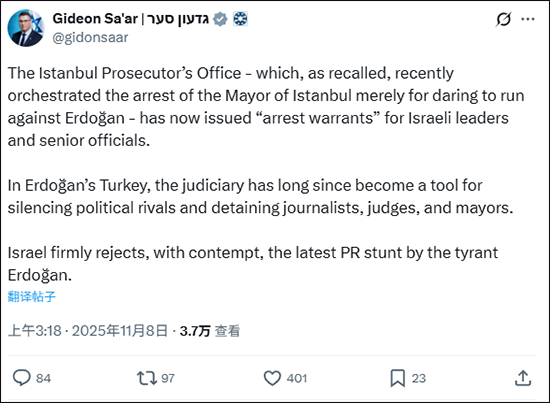 以色列外长萨尔(Gideon Saar)在X平台上表示,“在埃尔多安治下的土耳其,司法机构早已沦为压制政治对手、拘捕记者、法官和市长的工具。而以色列以蔑视的态度坚决拒绝‘独裁者’埃尔多安的最新‘公关作秀’。”