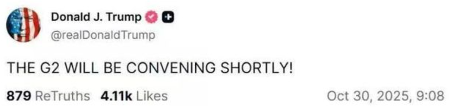 因为就在中美元首会晤前一天,特朗普在社交媒体上发布了英文大写推文“THE G2 WILL BE CONVENING SHORTLY!”(G2峰会即将召开!)。