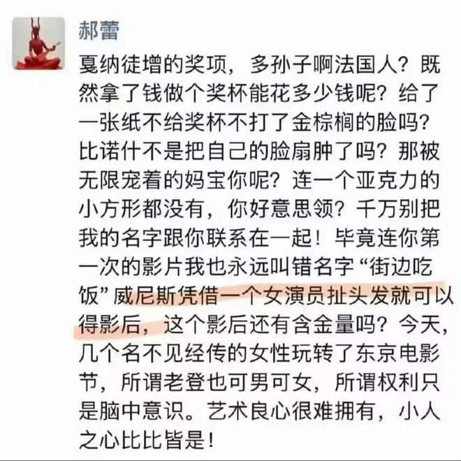 还没完,郝蕾的怒火不只针对个人,更是直接扫射了本届东京电影节。骂这帮老登幕后操控话语权。言外之意就是,所谓的获奖名单早就内定,根本不是基于作品质量和实力评选,而是一场大佬们之间的利益游戏,把影圈奖项的遮羞布撕得干干净净。