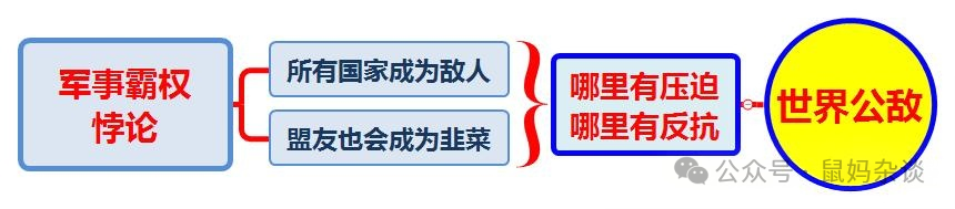 军事霸权的悖论是霸权会将所有国家逼成敌人,包括自己的盟友,哪里有压迫,哪里就会有反抗,自己便成了世界公敌,1VS200,必输。