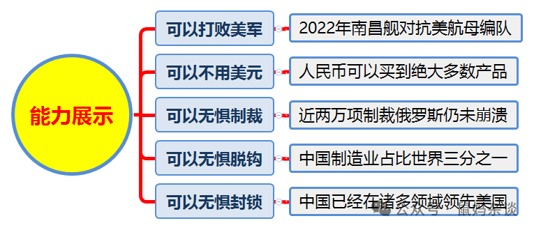 展现能力是为了证明:我们可以击败美军、去美元化、无惧制裁脱钩封锁。大家都知道美国在政治、军事、经济上无法击败中国,仅剩下远程养殖领域遥遥领先,有人甚至不领狗粮仍能维护美国形象。