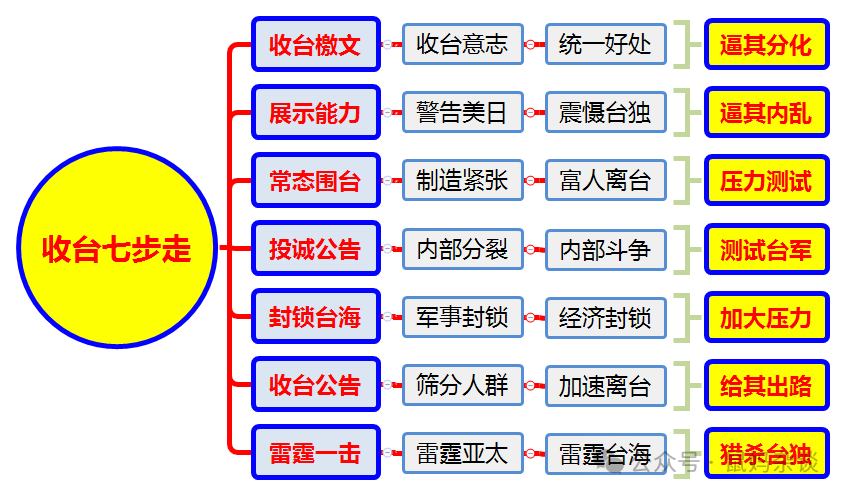 第一步:发布收台檄文,说明台湾的历史经纬,表明收台决心和统一后的好处,逼其社会分化,主要是帮助被“台独”洗脑的人看清历史真相,实现台湾社会的初步分化;