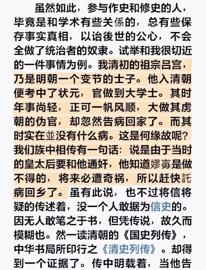 就在大家还在为“康熙生父是谁”争论不休时,近代著名历史学家吕思勉家族的一段隐秘记录,直接给这起惊天丑闻添了一把猛料。吕思勉在自己的记载中提到,他们家祖上出了个大人物叫吕宫,是顺治年间的状元郎,凭借过人的才华在清朝官场一路平步青云,很快就跻身权力顶层,深受顺治帝的信任和倚重,堪称当时朝堂上的红人。