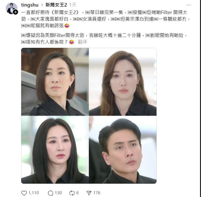 《新闻女王2》开播后,该剧在演员妆造和气场方面获得不少好评。剧中佘诗曼延续 Man 姐的飒爽风格,经典西装搭配低马尾,凸显雷厉风行的特质,李施嬅升任 SNK 电视部副总监后,高级套装与珠宝配饰强化了精英感。 不过部分观众对剧中使用的美颜滤镜提出质疑,认为过度磨皮和美白导致画面失真,演员面部细节丢失,因此纷纷留言:“看完第一集,发现他们的滤镜开得太猛了,大家的脸都很白,女演员还好,但黄宗泽白到连一...