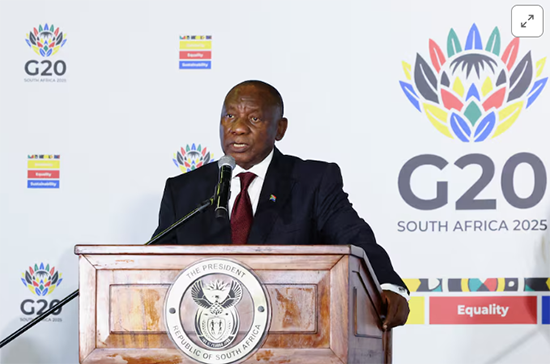 当地时间11月14日,南非总统拉马福萨表示,鉴于美国决定缺席下周的二十国集团(G20)峰会,本届峰会将以象征性方式将下一届峰会主席国职位“交给一把空椅子”,作为对美方缺席的回应。但他也同时强调,南非虽对此不满,但仍将维持与美国的经贸关系以保障本国利益。