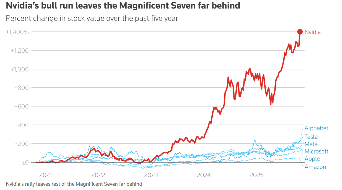 涌入人工智能的能源与金钱是惊人的。预计到本年底,全球在该技术上的花费将达3750亿美元,2026年将达5000亿。自ChatGPT问世以来,标普500指数涨幅的75%由AI相关股票贡献;其价值在某种程度上提振了每一家上市公司。作为AI热潮的核心芯片制造商,英伟达昨日成为史上首家市值破5万亿美元的公司。