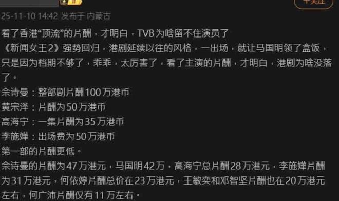 TVB剧《新闻女王2》播出后掀起观众追看热潮,近日有内地网友曝光剧中演员的薪酬表,称佘诗曼接拍《新闻女王2》片酬100万,黄宗泽则仅收50万,有网友留言调侃:“黄宗泽性价比太高了!”