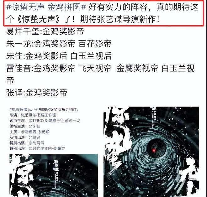 这边宋佳深陷舆论泥潭,那边张艺谋执导的《惊蛰无声》却借着金鸡奖的热度疯狂营销。影片专门打造了“金鸡拼图”的热搜词条,高调宣传电影阵容超强,班底无敌,四位金鸡影帝和一位金鸡影后加盟,试图借着奖项东风收割一波关注度。但明眼人都能看出,这背后的利益链条实在太过明显。