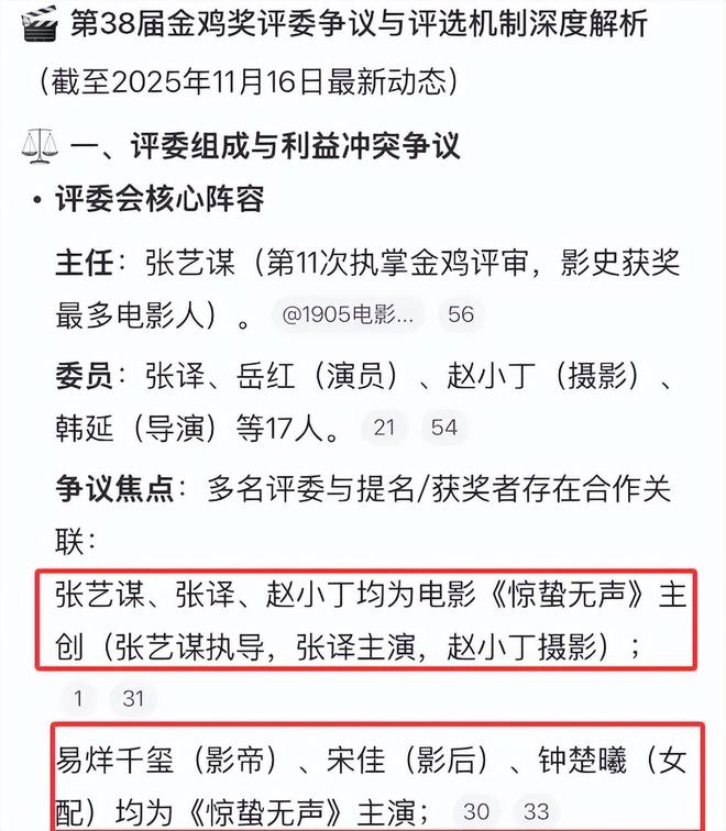 本届金鸡奖的评委阵容本身就充满争议:评委主任是张艺谋,委员包括张译、岳红、赵小丁等人。而巧合的是,张艺谋、张译、赵小丁都是《惊蛰无声》的核心主创。更离谱的是,恰好《惊蛰无声》的主演易烊千玺、宋佳、钟楚曦包揽了本届金鸡奖的男女主和女配奖项,真难为他们居然放过了男配。不可否认,这三位演员的演技或许有可圈可点之处,但如此明晃晃的内部分割资源,实在难以让观众信服。