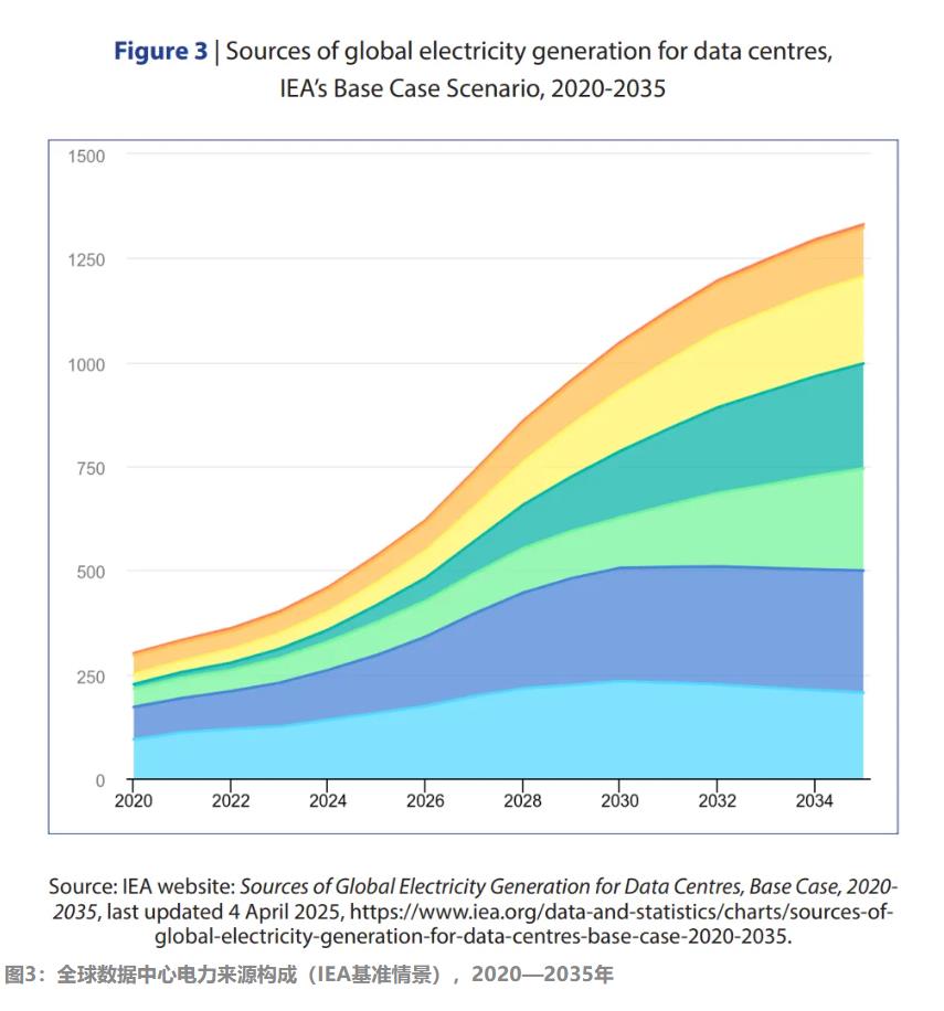 图3:全球数据中心电力来源构成(IEA基准情景),2020—2035年