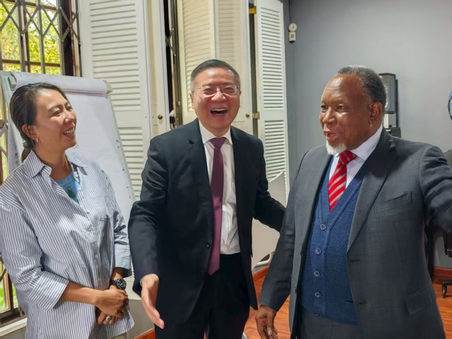 南非前总统莫特兰蒂会见张维为教授一行,双方亲切交谈。