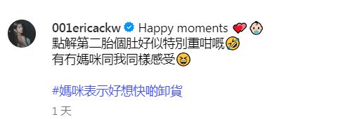 TVB小花陈嘉慧在2023 年宣布结婚,闪嫁圈外富贵男友Calvin,次年3月生下女儿。然而产后复出不久,今年8月再度宣布怀二胎。近日,陈嘉慧在社交网晒出与女儿的近照,发文:“幸福时刻❤️ 为什么第二胎的肚子感觉特别重呀?有没有妈咪和我有同样感受~妈咪表示好想快点卸货”。 从照片中可见,她虽穿宽松长裙,但孕肚依然十分明显,另外,小女儿亦明显长大,遗传了妈妈的圆圆大眼,相当可爱!陈嘉慧则一手抱着女...