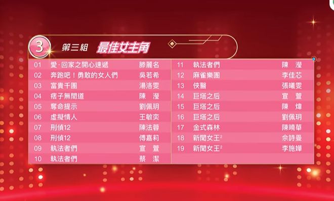 至于视后方面,《新闻女王2》的佘诗曼以大热姿态登场,宣萱凭两套重头剧《执法者们》和《巨塔之后》获得双提名,特别是《巨塔之后》这部医疗权斗剧,被视为能与《新闻女王2》抗衡的大女主剧集。宣萱在剧中展现的气场与演技,绝对是力阻阿佘封后的最强劲敌。