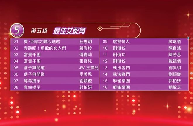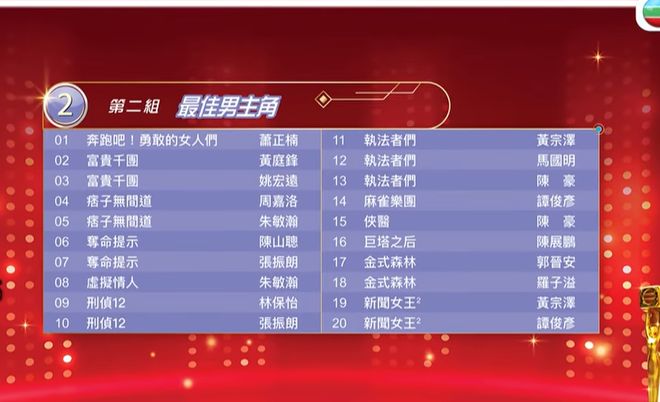 而最佳男配角中,视帝马国明凭客串演出《新闻女王2》入围,而获力捧的丁子朗则分别凭《夺命提示》《执法者们》及《侠医》获得3张入场券角逐。