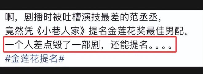 更让人不适的是,面对铺天盖地的演技质疑,范丞丞不仅没正视短板,反倒态度强硬不服气,暗戳戳觉得是网友刻意网暴,好几次在公开场合内涵吐槽,人不行怪路不平,好像他的演技已经好到出神入化的地步,只是观众庸俗,看不透而已,年轻演员该有的谦逊丝毫看不出来。本来演技差这事大家虽然骂,但也不是不能接受,毕竟现在娱乐圈的演员演技都烂,但范丞丞这个甩锅的态度实在是让人无法接受,导致他路人好感度直线下滑。而这次能入围金莲花奖,外界也早有猜测,大概率是背后靠姐姐运作铺路,想靠一个含金量不足的提名勉强挽尊,堵住外界对他演技的吐槽。