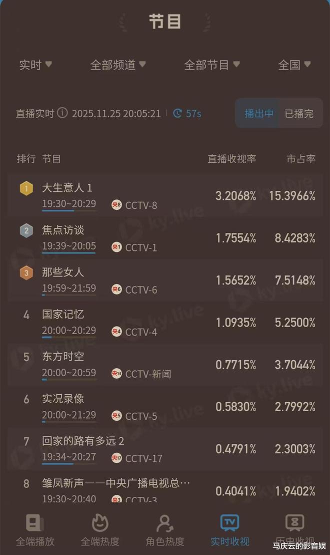 先讲几句题外话。因为有几部流量古装剧在央八的收视率不好,所以,坊间有个遮羞的说法,说古装剧在央八收视率很低。这一次,《大生意人》在央八播出,在酷云上,首集的收视率就冲破了3.2%,这样的成绩可以说明,央八没有所谓的古装剧魔咒。质量高的电视剧,好看的电视剧,不分古装还是非古装,都会收视率高。