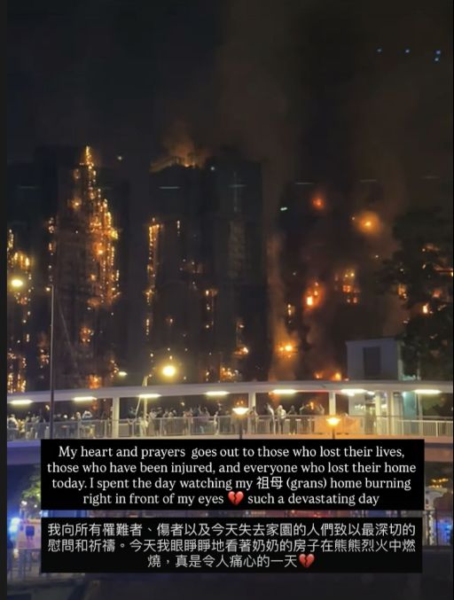 前港姐冠军谢嘉怡发文表示:“我向所有遇难者、伤者以及今天失去家园的人们致以最深切的慰问和祈祷。今天我眼睁睁地看着奶奶的房子在熊熊烈火中燃烧,真是令人痛心的一天。”