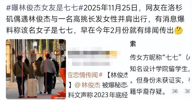 事情的起因是网友在洛杉矶的时候,偶遇了林俊杰,他正在和一个年轻女子逛街,两人都穿着棕色外套、白色长裤,举止亲密。穿着情侣装和异性单独出来游玩,怎么看都不像是普通朋友关系,随后,关于林俊杰恋情的话题就发酵起来了。