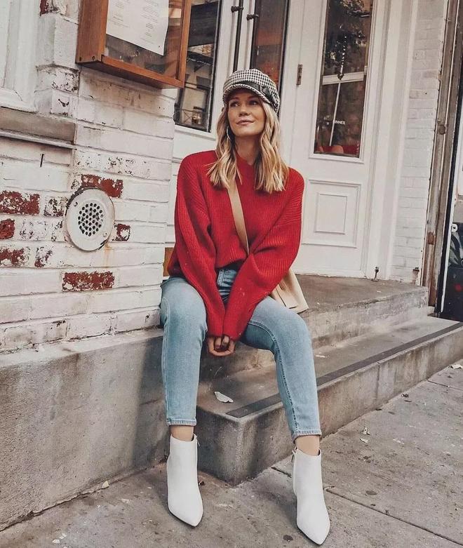 红色针织毛衣,能在不同搭配中轻松展现女性的大方、时髦与精致,让冬日造型告别沉闷,搭配一条浅色系牛仔裤,完美展现出女性的干练与知性气质,再搭配一双白色靴子,尽显自信大方的时髦格调。
