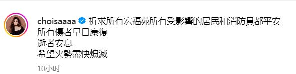 蔡卓妍亦发文表示:祈求所有宏福苑所有受影响的居民和消防员都平安,所有伤者早日康复,逝者安息。希望火势尽快熄灭。