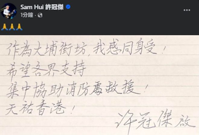 歌神许冠杰发文:作为大埔街坊,我感同身受!希望各界支持,集中协助消防处救援!天佑香港!