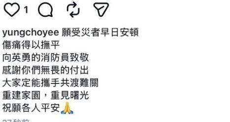 香港不少艺人也行动起来,天后容祖儿亦有发文哀悼:愿受灾者早日安顿,伤痛得以抚平,向英勇的消防员致敬,感谢你们无畏的付出,大家定能携手共渡难关,重建家园,重见曙光,祝愿各人平安。