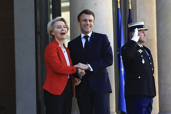 2023年4月3日,法国巴黎,冯德莱恩与马克龙致意。两位领导人随后便访问了中国。 视觉中国