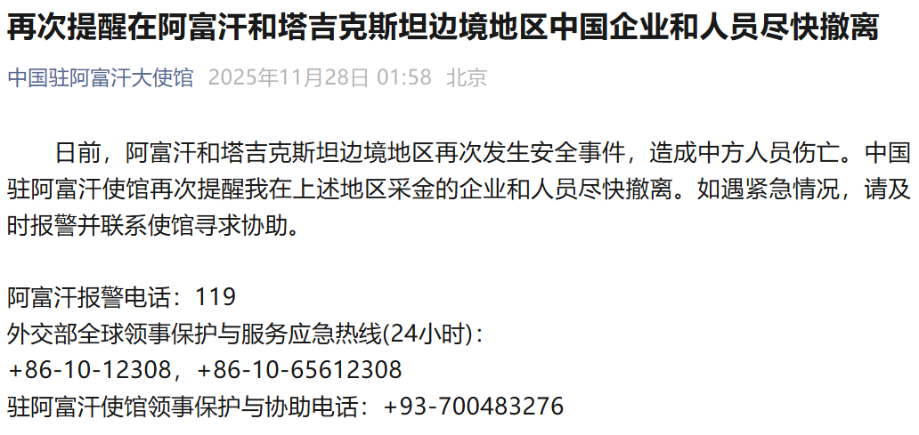 日前,阿富汗和塔吉克斯坦边境地区再次发生安全事件,造成中方人员伤亡。中国驻阿富汗使馆再次提醒我在上述地区采金的企业和人员尽快撤离。如遇紧急情况,请及时报警并联系使馆寻求协助。阿富汗报警电话:119外交部全球领事保护与服务应急热线(24小时):+86-10-12308,+86-10-65612308驻阿富汗使馆领事保护与协助电话:+93-700483276中国驻阿富汗大使馆微信公众号截图...