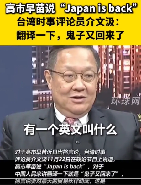 日本全国的思想已经全面军国主义化了,高市早苗公开喊出了“Japan is back”,连台湾的时事评论员都知道这事是啥意思,那就是“鬼子又回来了”。