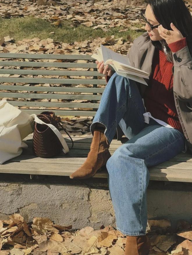 如果你选的是牛仔的微喇九分裤,可以配一双棕色的短麂皮靴,内搭选修身且简约的款式。
