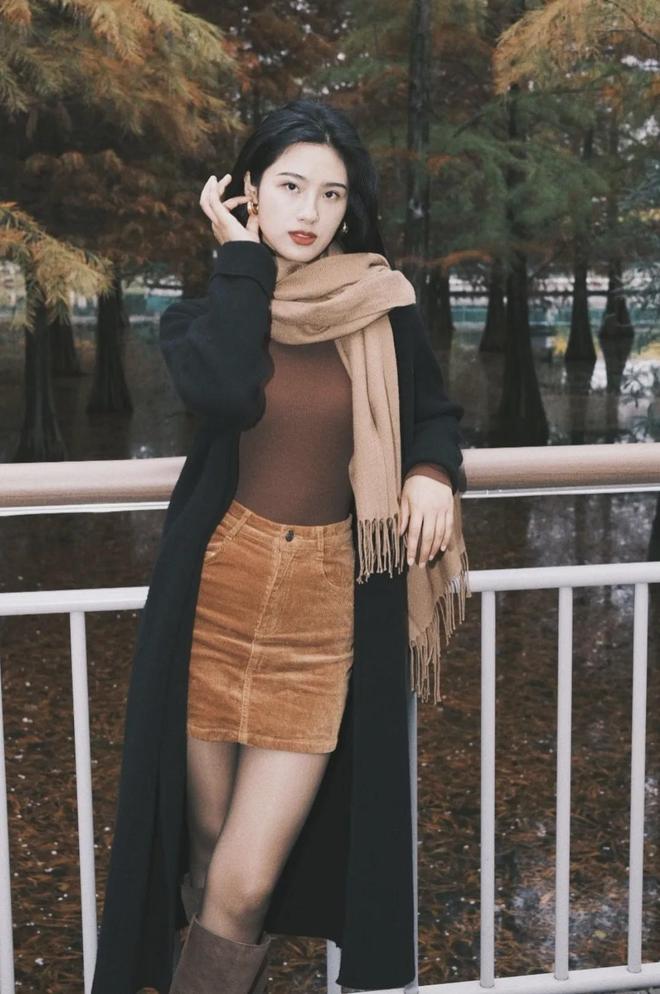 下穿一条灯芯绒短裙,还配了一条浅黑色的打底裤。下搭一双复古的深棕色麂皮靴,配条棕色的围巾更是点睛之笔。