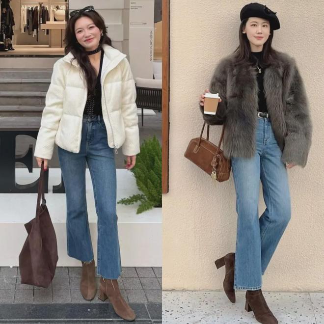外面再搭个毛绒外套或者是羽绒服,整体看起来复古又时髦。再加点帽子或同材质的麂皮包等配饰,有效增加细节感。