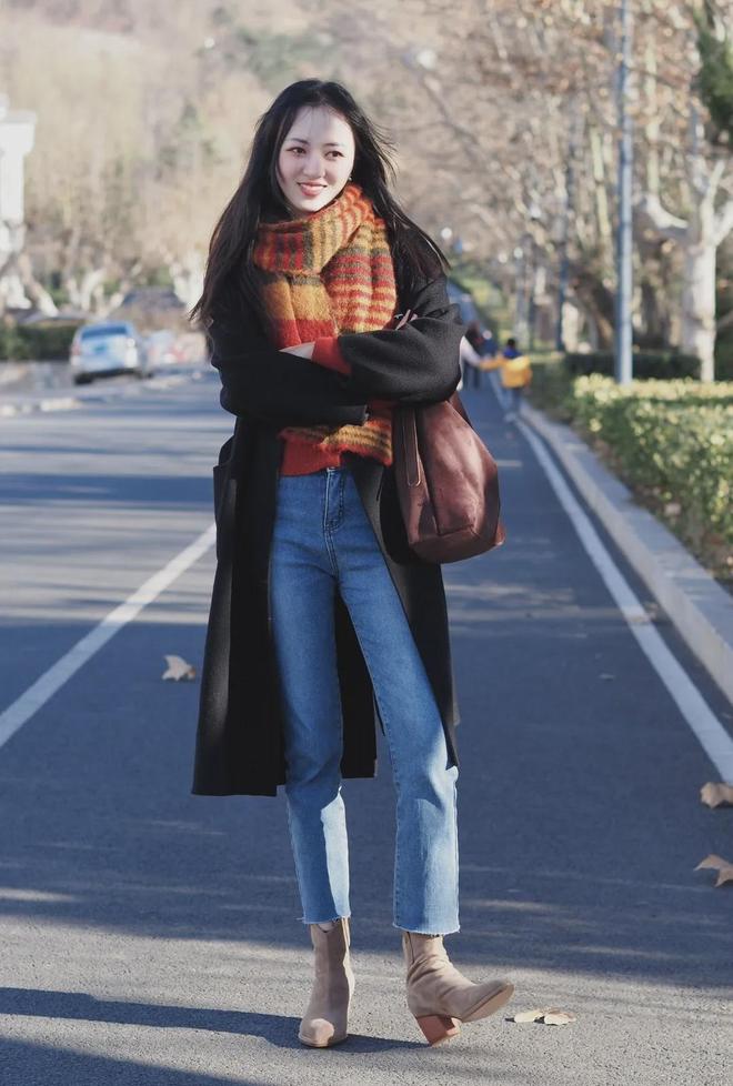 配上一条彩色的围巾和棕色的麂皮包,麂皮包跟麂皮靴的材质相呼应,穿搭就显得更有质感了。