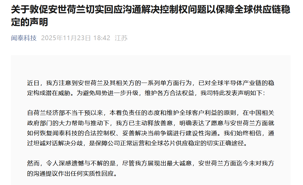 而在此前的11月19日,荷兰经济事务大臣文森特·卡雷曼斯宣布,将暂停对安世半导体的监管决定,以回应中国的“善意”。包括《纽约时报》在内的诸多外媒,都称之为“荷兰交还安世控制权”。