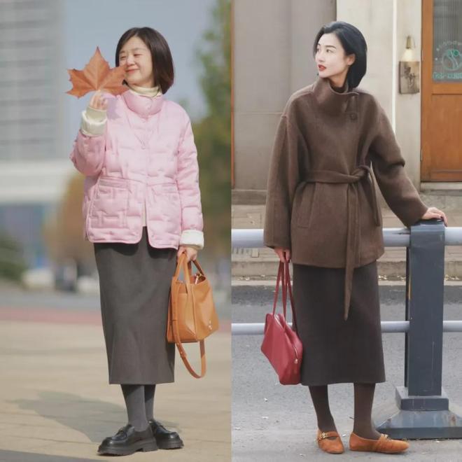 大家不信的话,可以看下图左的博主身上这套穿搭,她就是穿着一件粉色的羽绒服,下身搭配的是一条褐色直筒裙,裙子里边穿了条深灰色连袜打底裤,鞋子是黑色的乐福鞋。