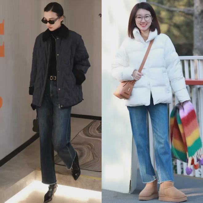 除了直筒裙,我们也可以用直筒裤来搭配中短款羽绒服,或者短款大衣,就像下图左这套。