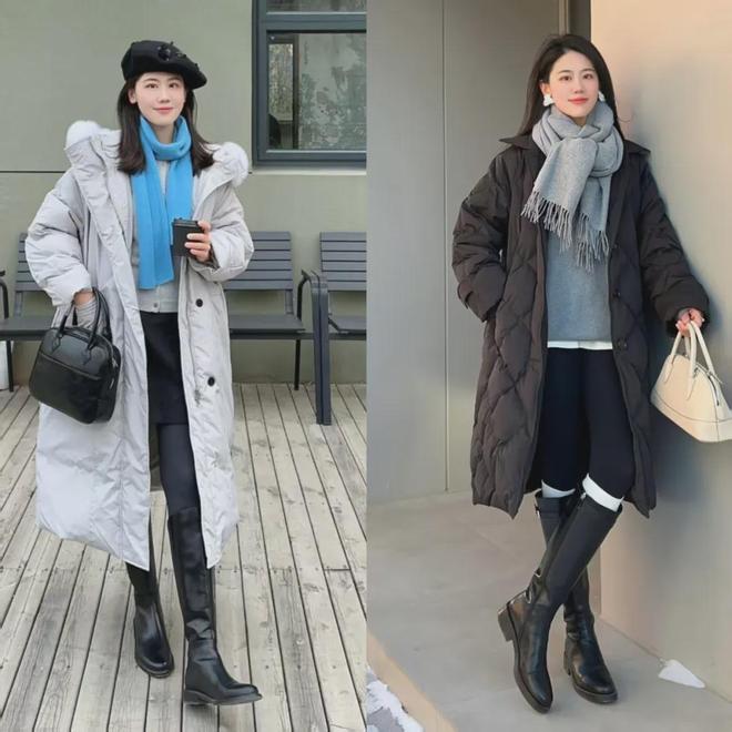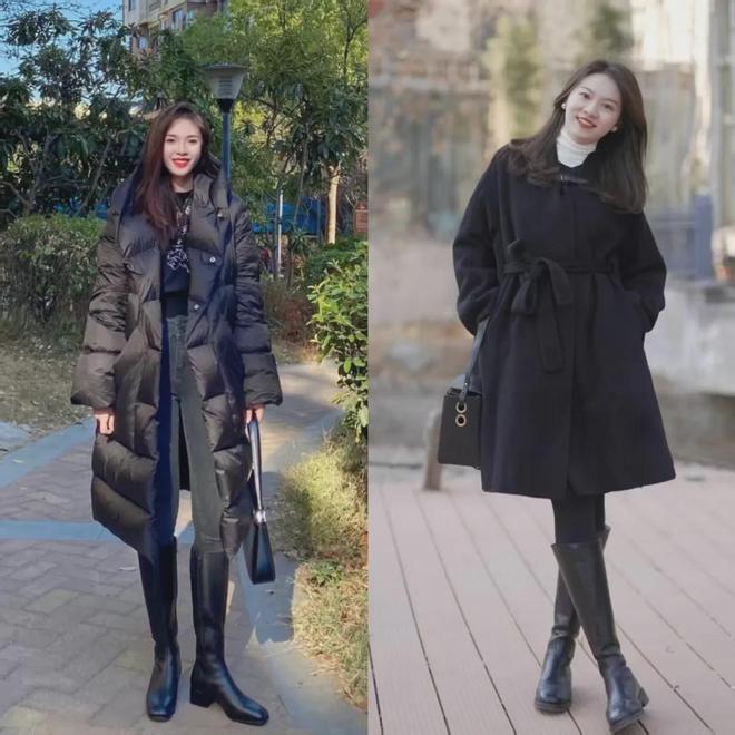 要是穿长款的羽绒服、大衣的时候,下身可以搭配一条加绒的紧身裤,再搭配一双长筒靴。