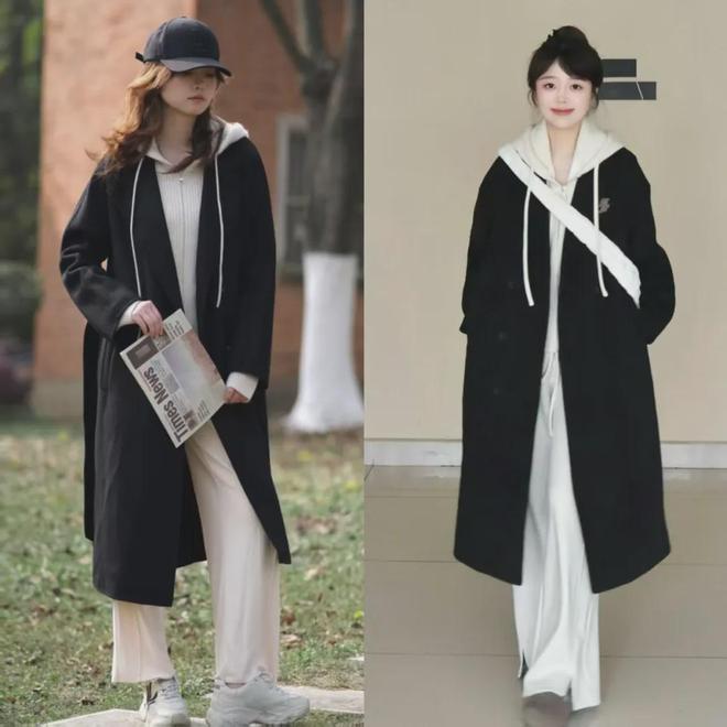 就比如说,我们可以选择一件白色的内搭,搭配一条白色的下装,这样的顺色搭配,不仅显高,看着也很利落。再穿上黑色的大衣,整套穿搭简约又大气。