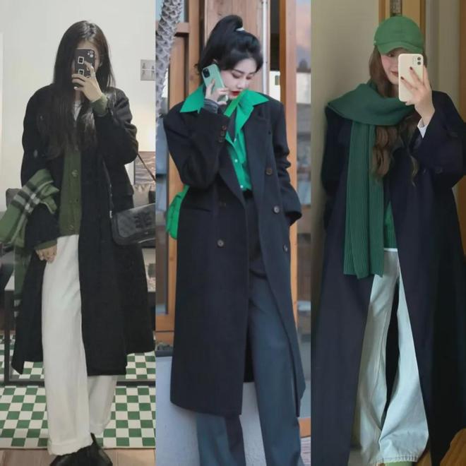我们可以像上面红色搭配黑色大衣一样,来搭配“黑色大衣+绿色”,选色调暗一点的绿色。