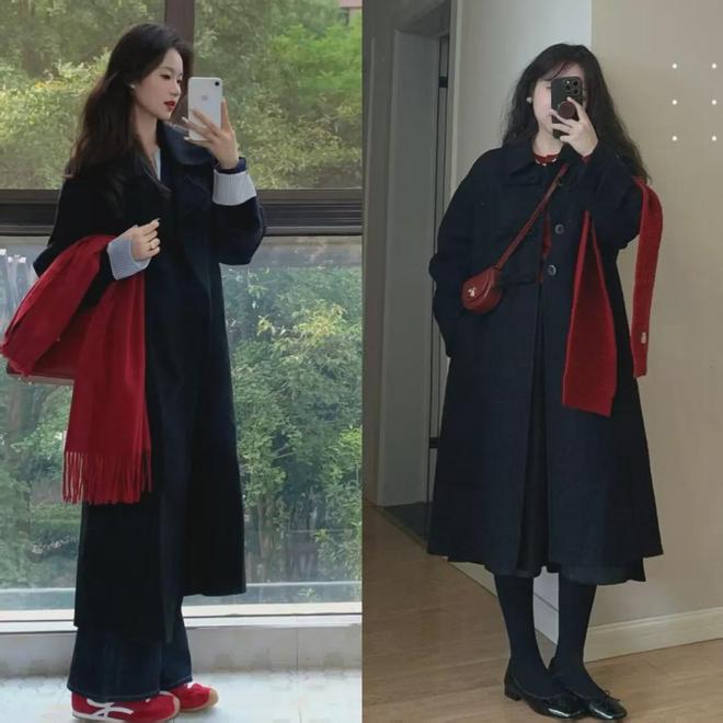 就比如说,我们可以选择一件红色的内搭,外面套上黑色大衣,下装穿一条黑色的裤子或者裙子,这样红色作为辅色,黑色作为主色,整体造型就会很协调。