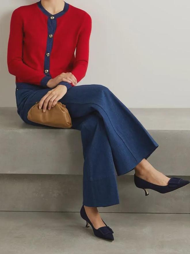 红色奶奶衫,圆领的设计,就像女人可以成为任何样子的无限可能,搭配一件蓝色牛仔阔腿裤。