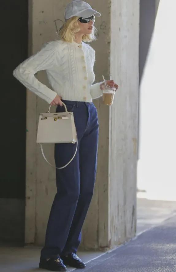 白色奶奶衫,用简单的颜色穿出高级的质感,获得舒适自在的感受,搭配一件蓝色低腰裤,越是简单越能穿出干练气质,一双黑色乐福鞋的打底,将女性的优雅和男性的帅气结合起来,即干练又高级