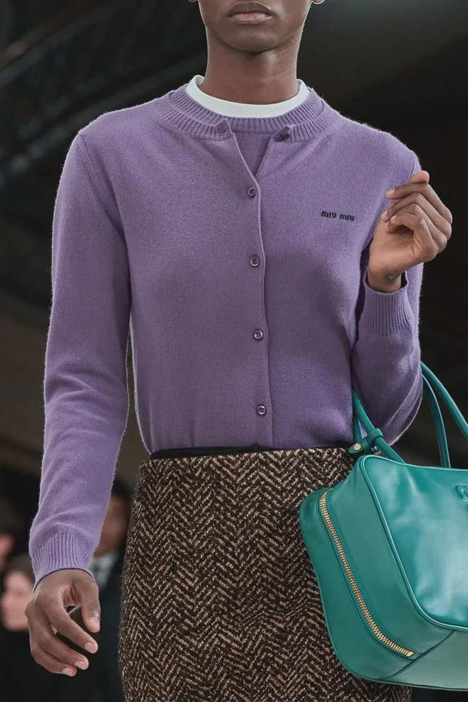 紫色奶奶衫,就能起到显高、显瘦的效果,内搭一件紫色打底,削弱了毛衣的几分慵懒,造型看起来更有精神,搭配一件格外半裙,能把人的质感和气质再次抬升,下角塞腰里,那么实穿,又那么美,始终有一种置身潮流之外的气度。