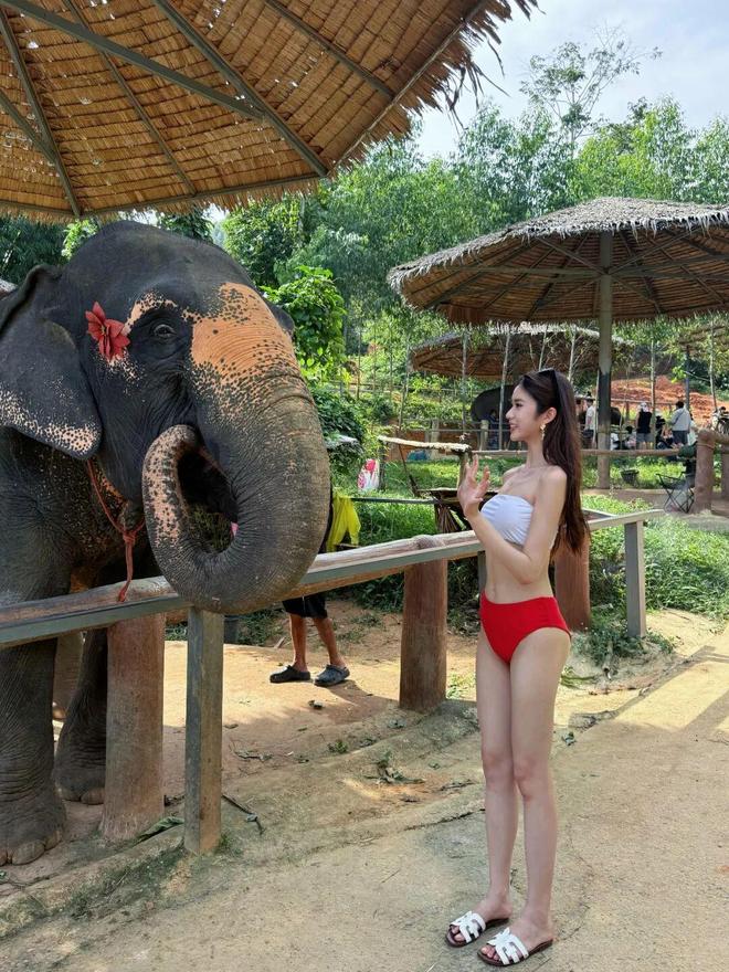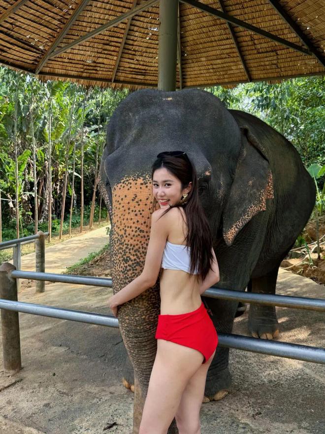 23岁港姐季军穿红白比基尼,给大象搓澡!靓照被赞性感尤物!