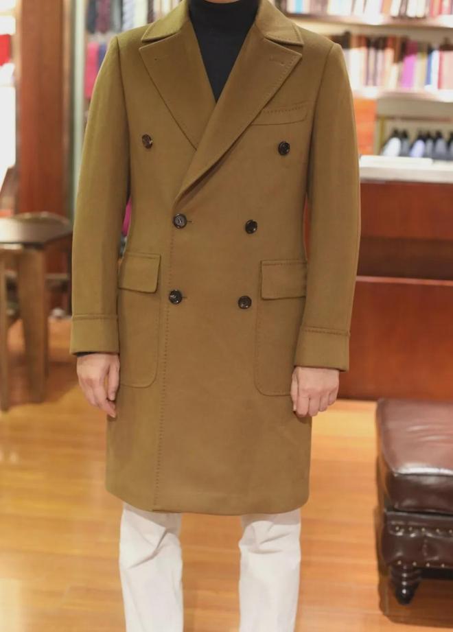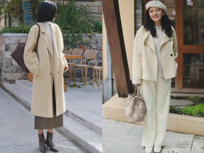 或者换成短款的米黄色大衣,搭配同色的裤子,中间再穿件白色的毛衣打底,这个造型就时髦又高级。