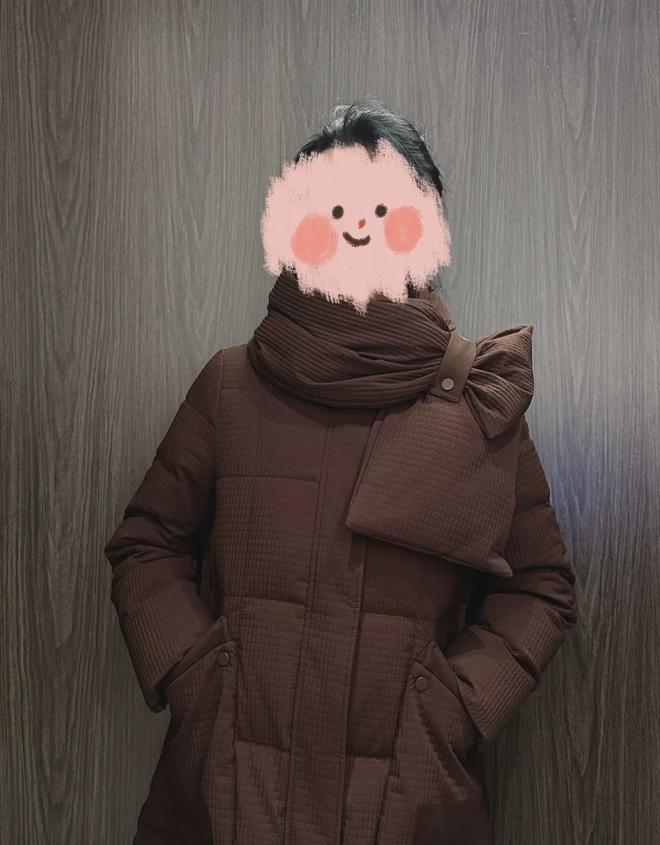 最简单的就是,用一件暗褐色的小高领打底,去叠穿一件米白色的羽绒服。