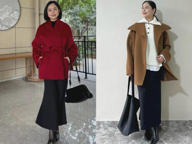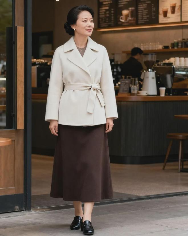 像一条暗褐色的半身裙,就可以搭配一件米白色的短款大衣。再把大衣的腰带系起来,整体就很有气质了。