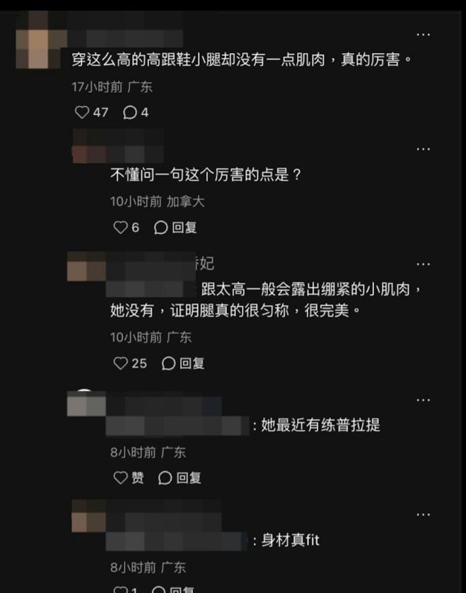 有网友分析张曦雯的腿部线条,惊叹:“穿这么高的高跟鞋小腿却没有一点肌肉,真的厉害。”也有网友表示:“鞋跟太高的话一般会露出紧绷的小腿肌肉,她完全没有,证明腿真的很匀称,很完美。