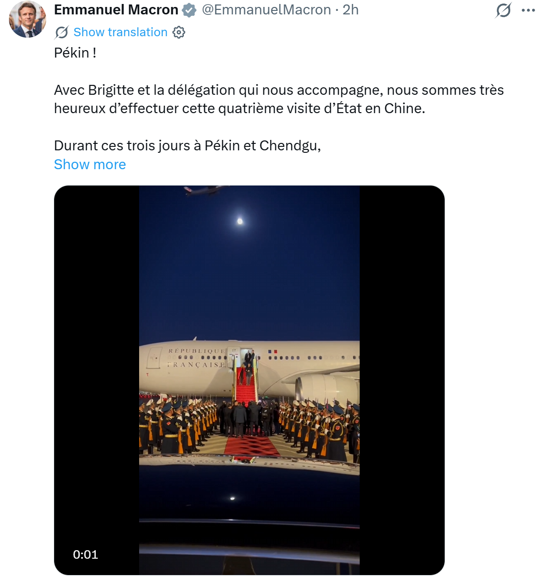 3日晚,马克龙在社交平台X发文称,很高兴对中国进行第四次国事访问。