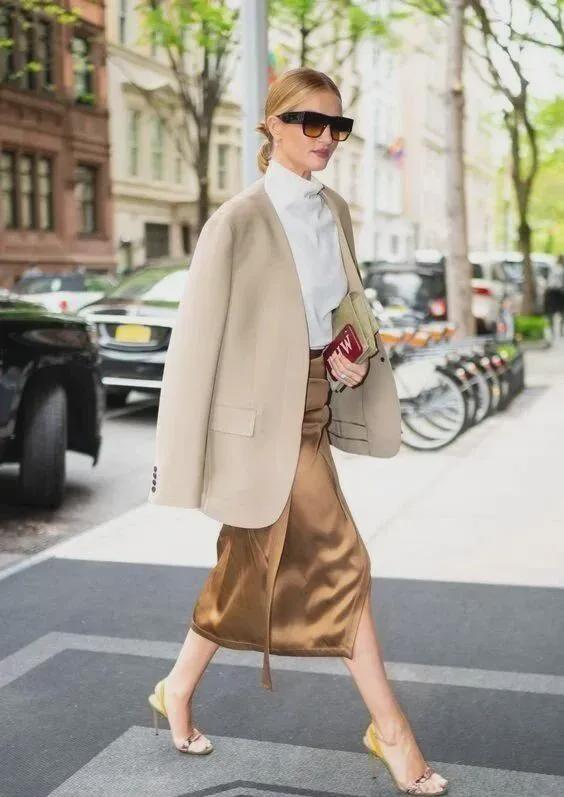 内搭一件白色立领衬衫,尽显优雅贵气,搭配一件香槟色真丝半裙,整体造型高贵又干了,轻松自在气质尽显